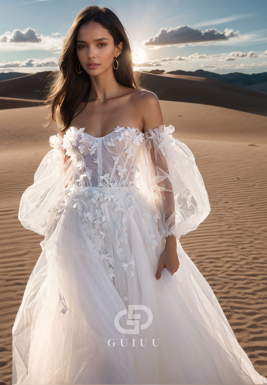 A-Line Long Sleeves Off-Shoulder Floral Appliques Lace Wedding Dress