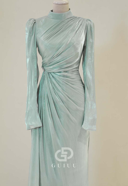 High Neck Long Sleeves Ruched Empire-Waist Formal Evening Dress