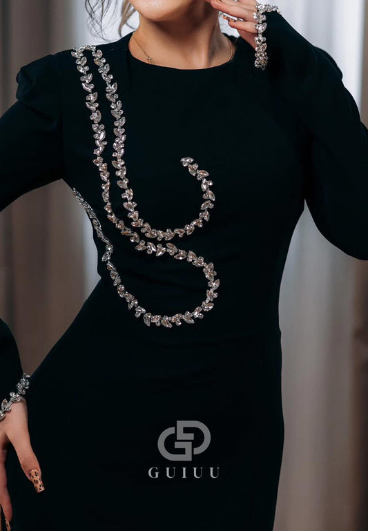 G4517 - Elegant & Luxurious Column Round Long SLeeves Black Ruched High Side Slit Sweep-Length Prom Evening Dress