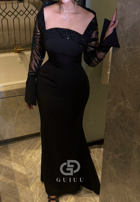 Black A-Line Long Sleeves Off-Shoulder Slit Evening Dress