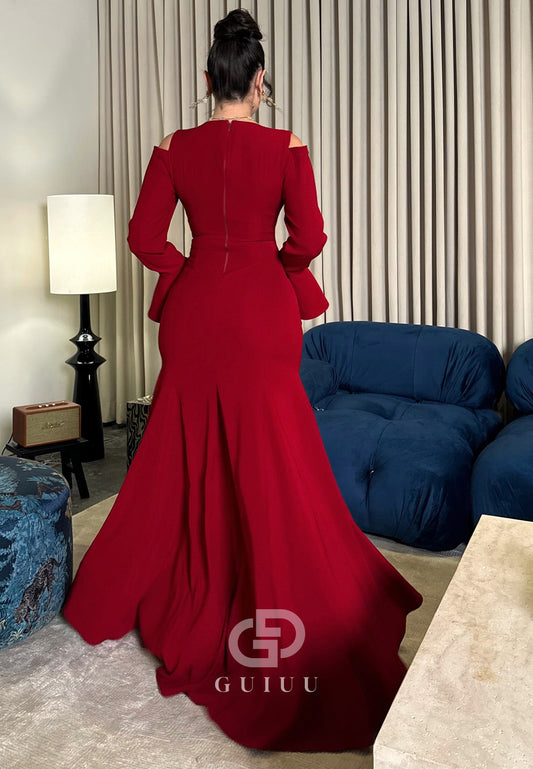 Red Long Sleeves Off-Shoulder Sequins Ruched Evening Dress