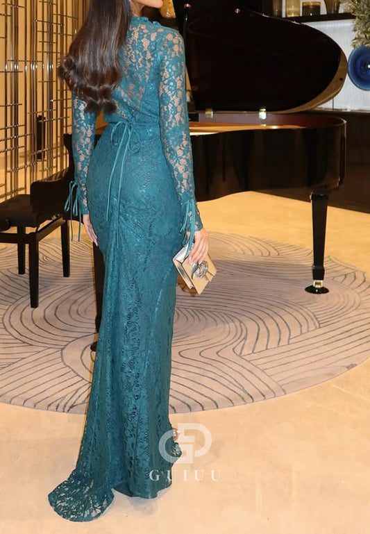 Black Long Sleeves V-Neck Corset Slit Lace Prom Dress
