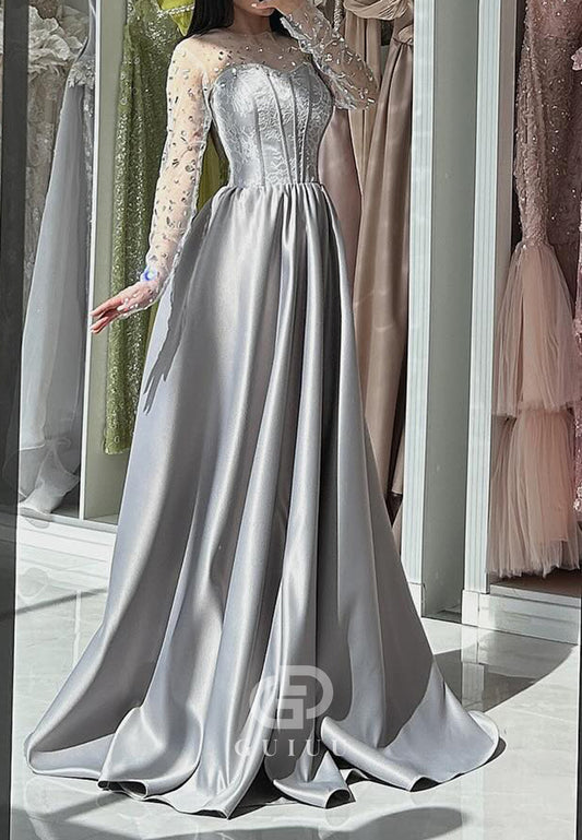 Long Sleeves Scoop Beads A-Line Empire-Waist Prom Dress