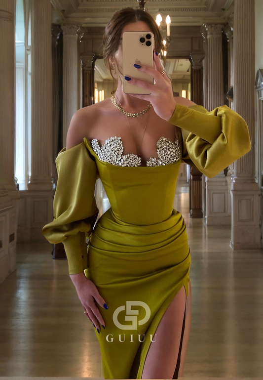 A-Line Off Shoulder Long Sleeves Beaded Long Prom Party Dress with High Side Slit
