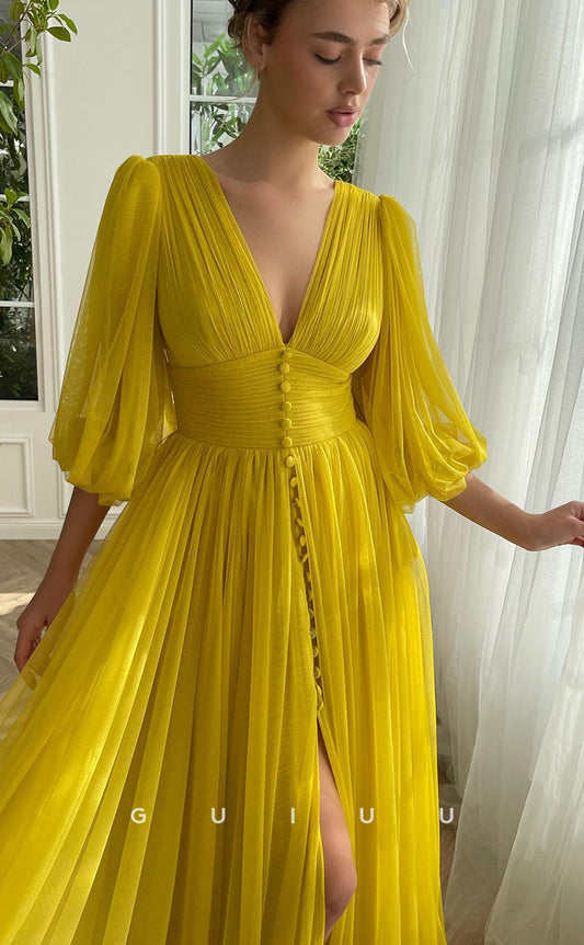 G4365 - Elegant & Timeless A-Line Deep V Neck Half Sleeveless Tulle Mesh Long Prom Dress with High Side Slit