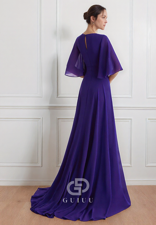 Regency V-Neck Short Sleeves Sweep Train Chiffon Mother of the Bride Dress
