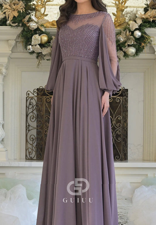 A-Line Long Sleeves Scoop Sequins Chiffon Mother of the Bride Dress
