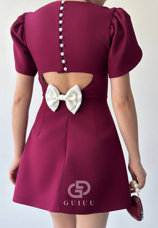 Burgundy Short Sleeves Scoop Bowknot Mini Party Dress