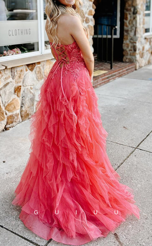 G2619 - A-Lin Strapless Straps Sleeveless Appliques Tulle Tiered Lace Up Long Prom Dress with Train