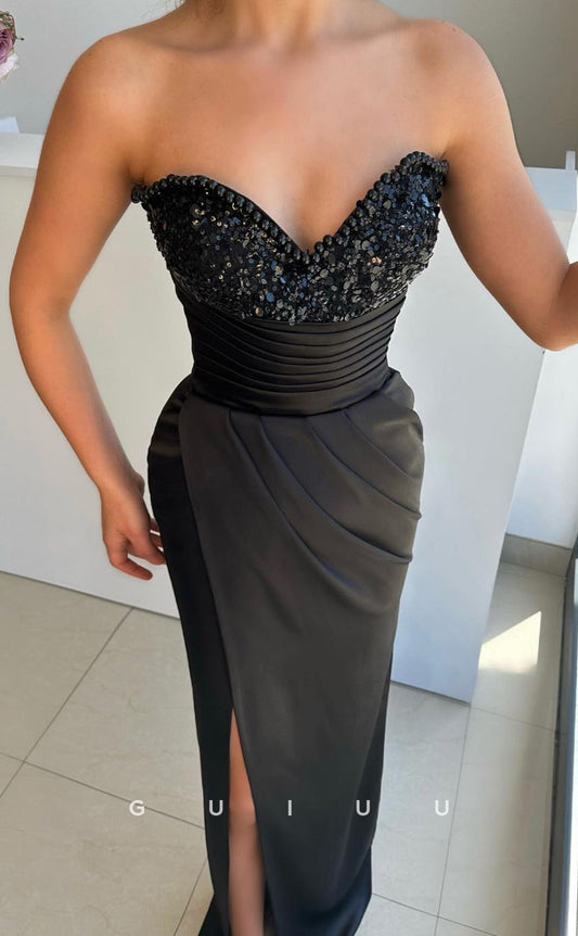 G2581 - Chic & Modern Strapless Sequins Ruched Long Prom Evening Dresses With Slit