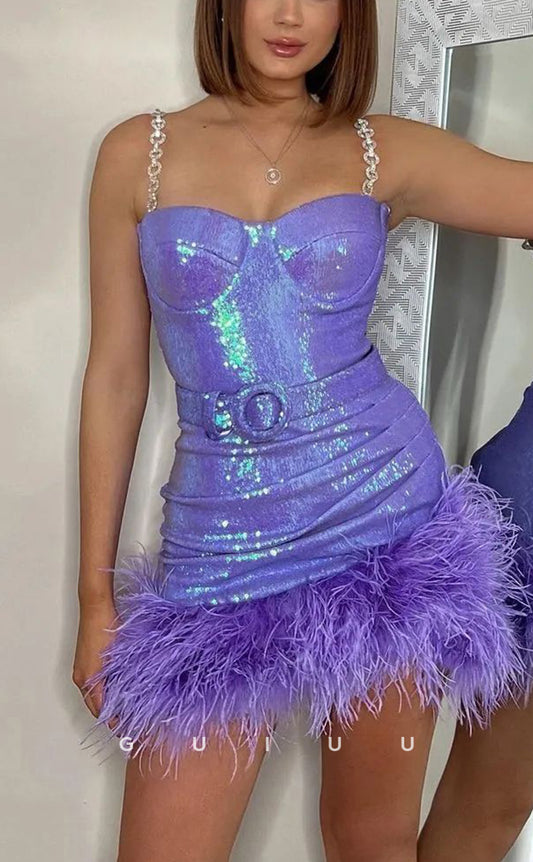 GH733 - Sexy Sheath Straps Ruched Short Homecoming Dress With Feather
