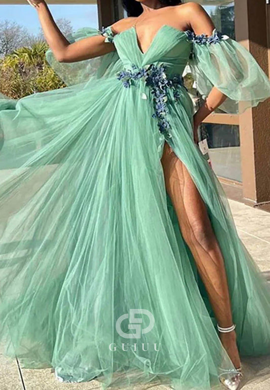 Off-Shoulder 3D Flower Appliqué High Slit Prom Dress
