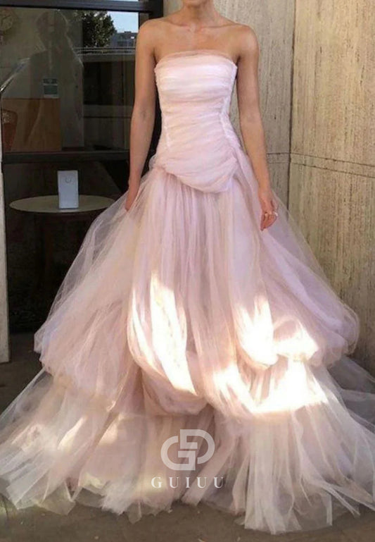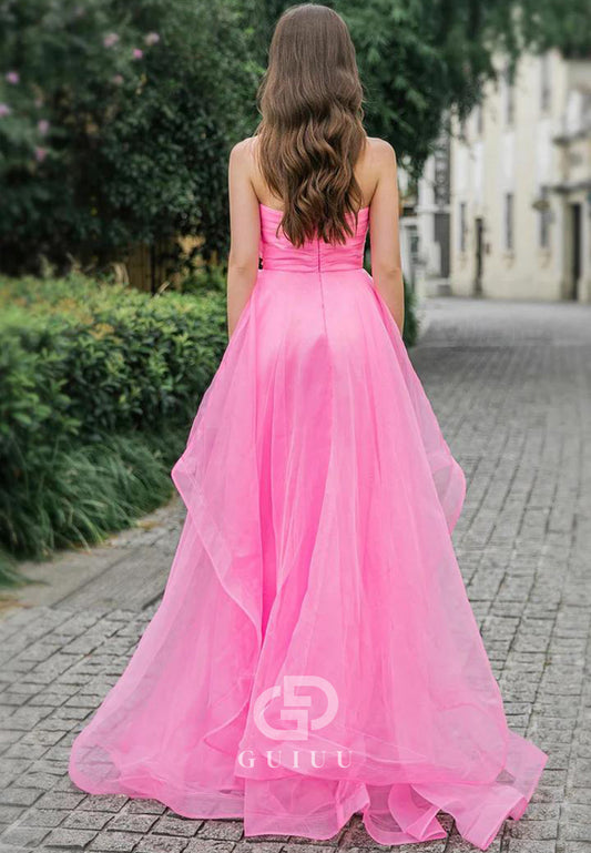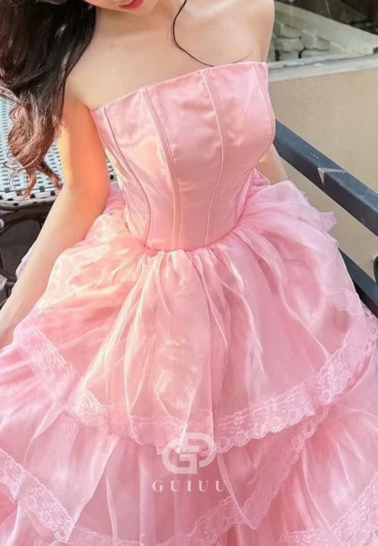 Pink A-Line Strapless Empire-Waist Layered Long Prom Dress
