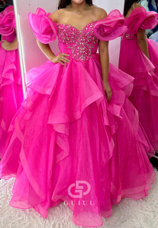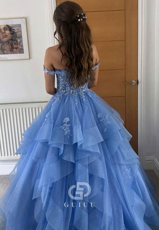 Off-Shoulder V-Neck Lace Appliques Ruffles Long Prom Gown
