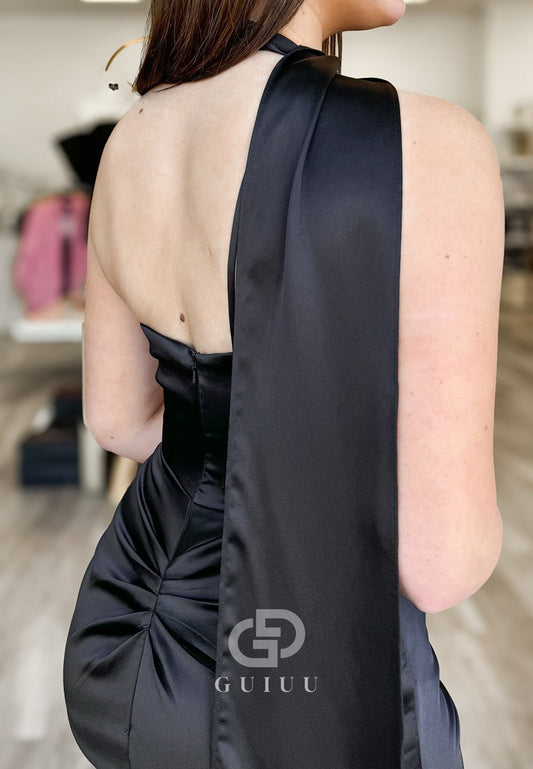 Black Halter Slit Ruched Floor-Length Prom Dress