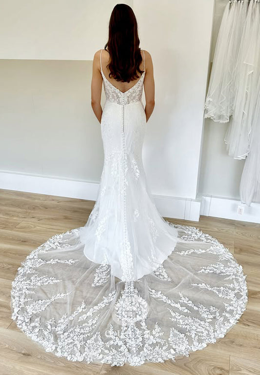 Spaghetti Straps V-Neck Floral Appliques Mermaid Wedding Dress