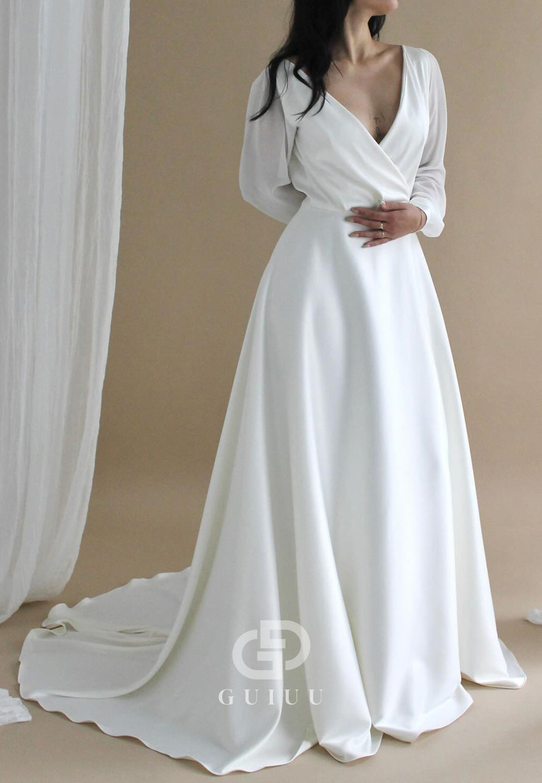 This A-line wedding dress features elegant long sleeves and a flattering V-neckline, designed to provide both grace and comfort. The empire waist gently accentuates your figure while allowing ease of movement, making it perfect for your special day. Its timeless silhouette offers a sophisticated look that supports your confidence and beauty throughout your celebration.