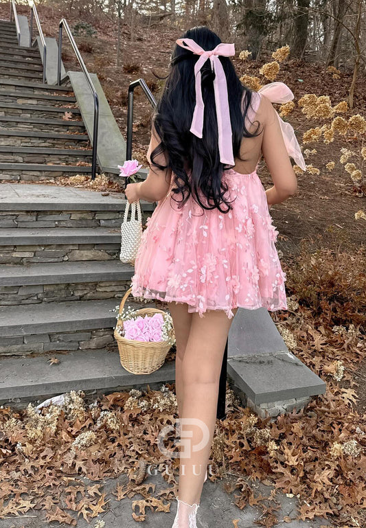 GH989 - A-Line One Shoulder Back Zipper Tulle Appliques Tiered Short Homecoming Dress