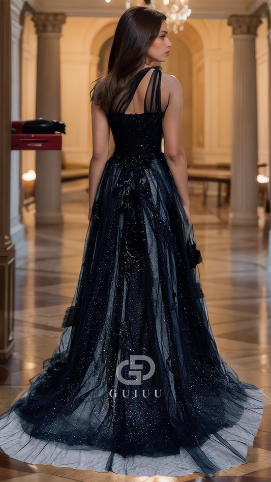Asymmetrical Beaded Sequined A-Line Tulle Prom Dress with Side Slit