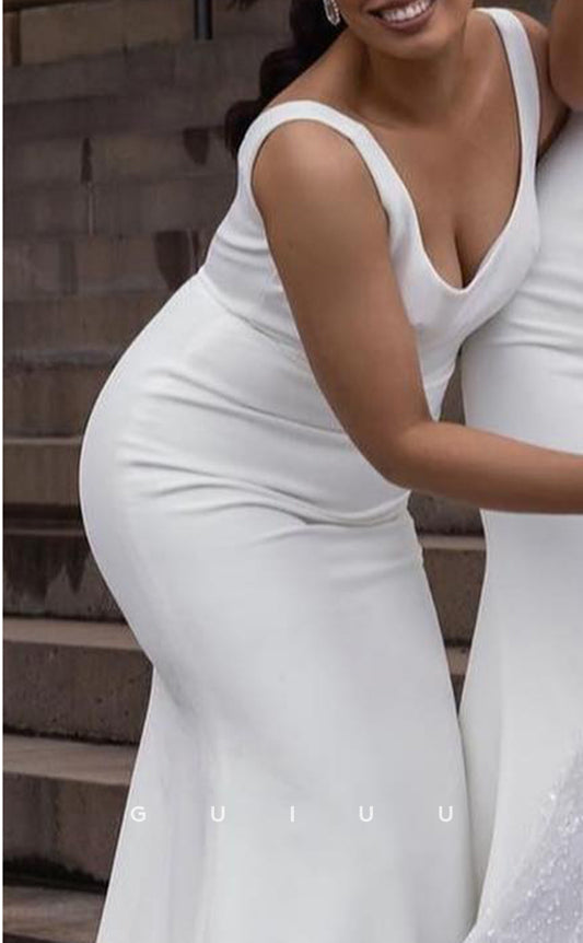 GB120 - Chic & Modern Sheath Straps High Side Slit Sweep Train White Bridesmaid Dress for Women