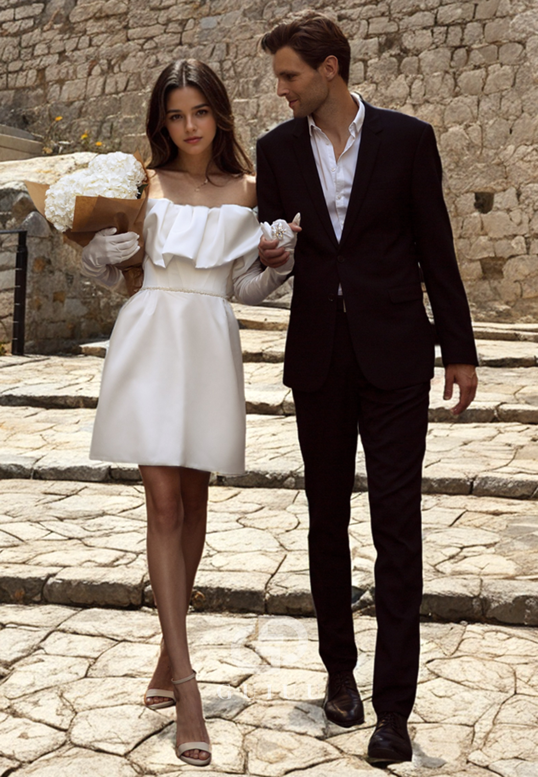 Exude elegance and sophistication in our A-Line Off Shoulder Satin Ruched Mini Wedding Dress. The off-shoulder neckline and ruched satin fabric enhance your curves, while the A-line silhouette flatters your figure. Perfect for a chic and intimate wedding, this dress is the epitome of luxury and exclusivity.