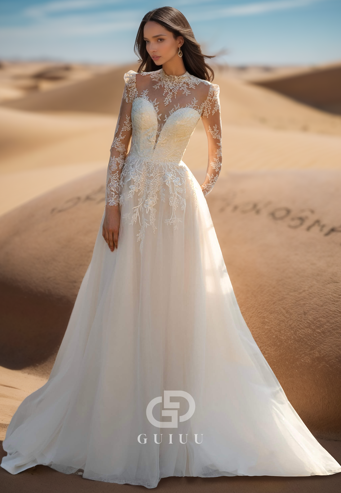 A-Line Long Sleeves High Neck Corset Tulle Lace Wedding Dress
