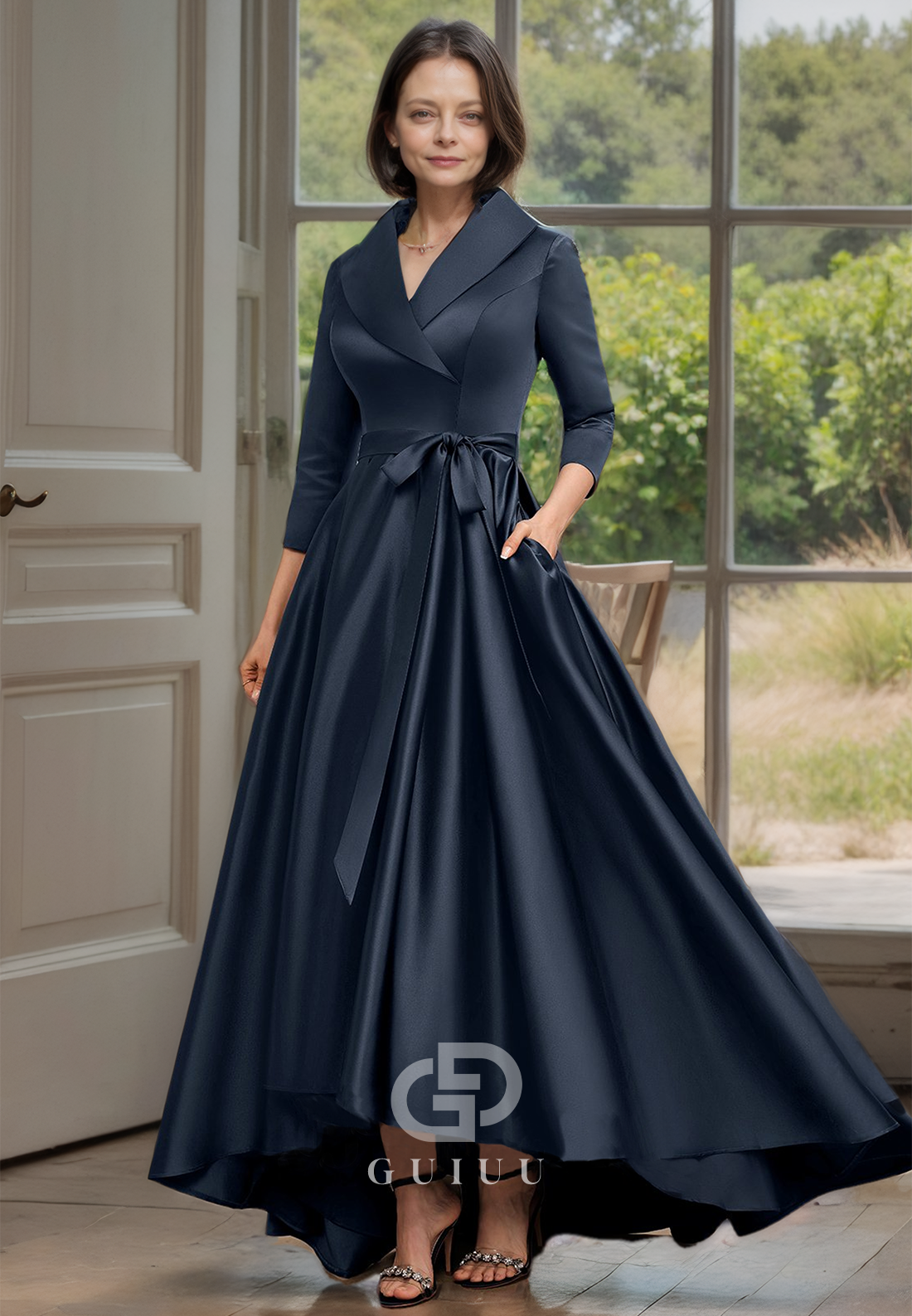 Sheath V-Neck A-Line Pleated 3/4 Sleeves Back Zipper Mother of Bride Dress