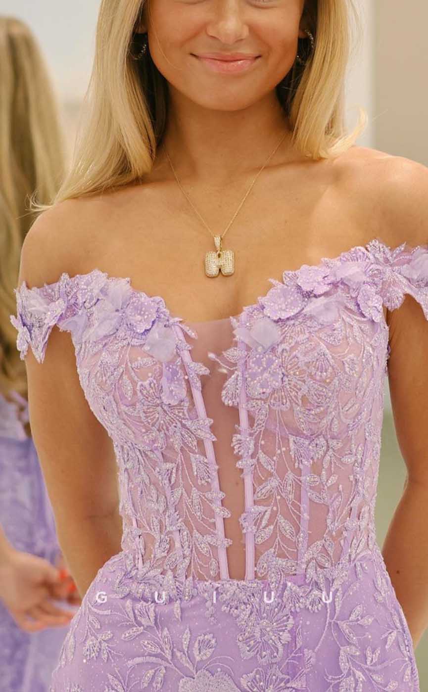 G4179 - Sexy & Hot Mermaid Off Shoulder Fully Floral Appliqued Evening Gown Prom Dress with High Side Slit and Sweep Train