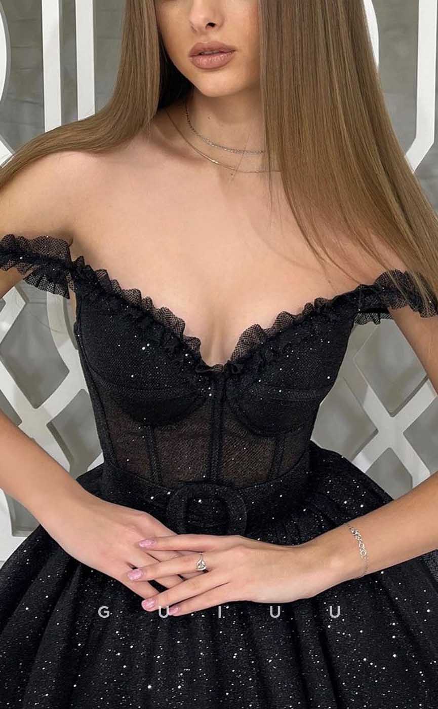 G4366 - Chic & Modern A-Line Off Shoulder Sparkly and Draped Ankle-Length Evening Gown Prom Dress with Sash and Ruffles