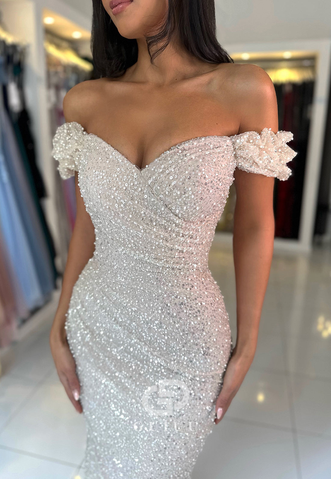 White Mermaid Off-Shoulder Sequins Sweep Train Prom Dress x 1;