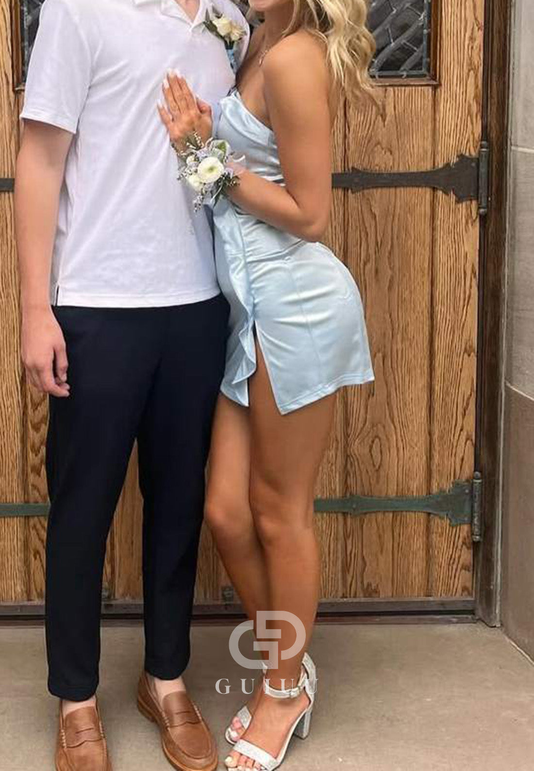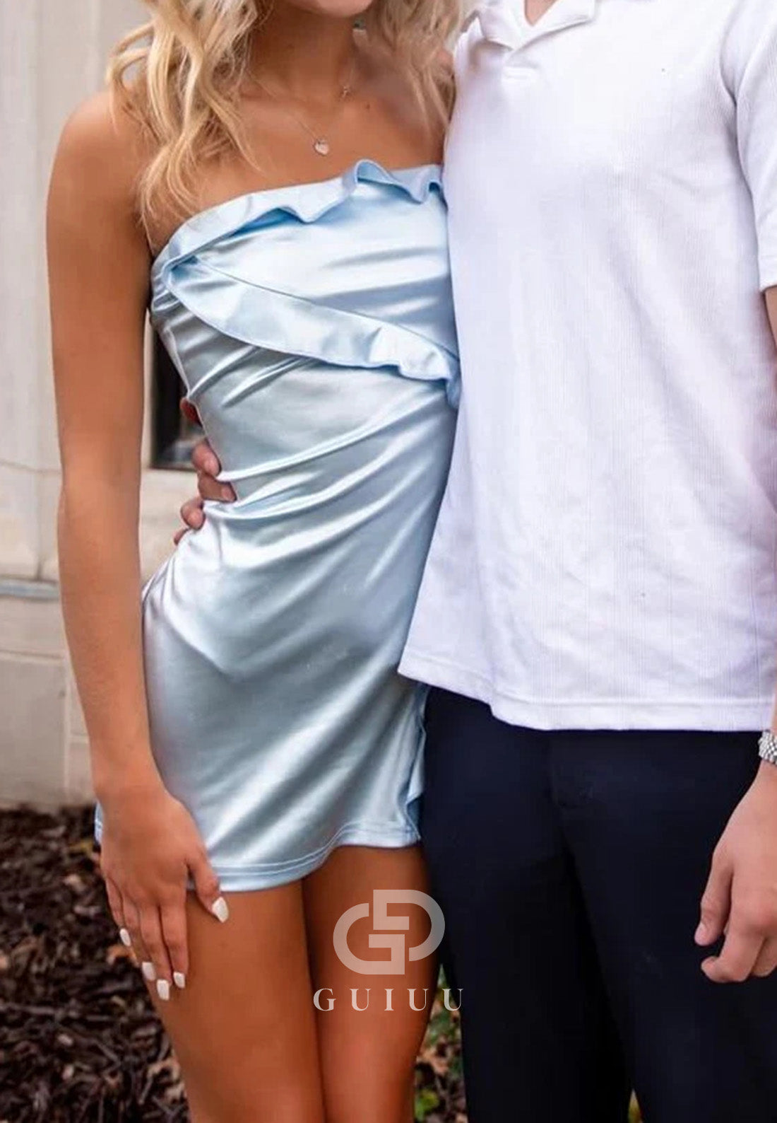 This mist-colored mini dress combines a strapless design with delicate ruffles and satin pleats, offering a sweet and elegant look for homecoming or party nights. Its flattering fit ensures you feel confident and comfortable, making every moment special.
