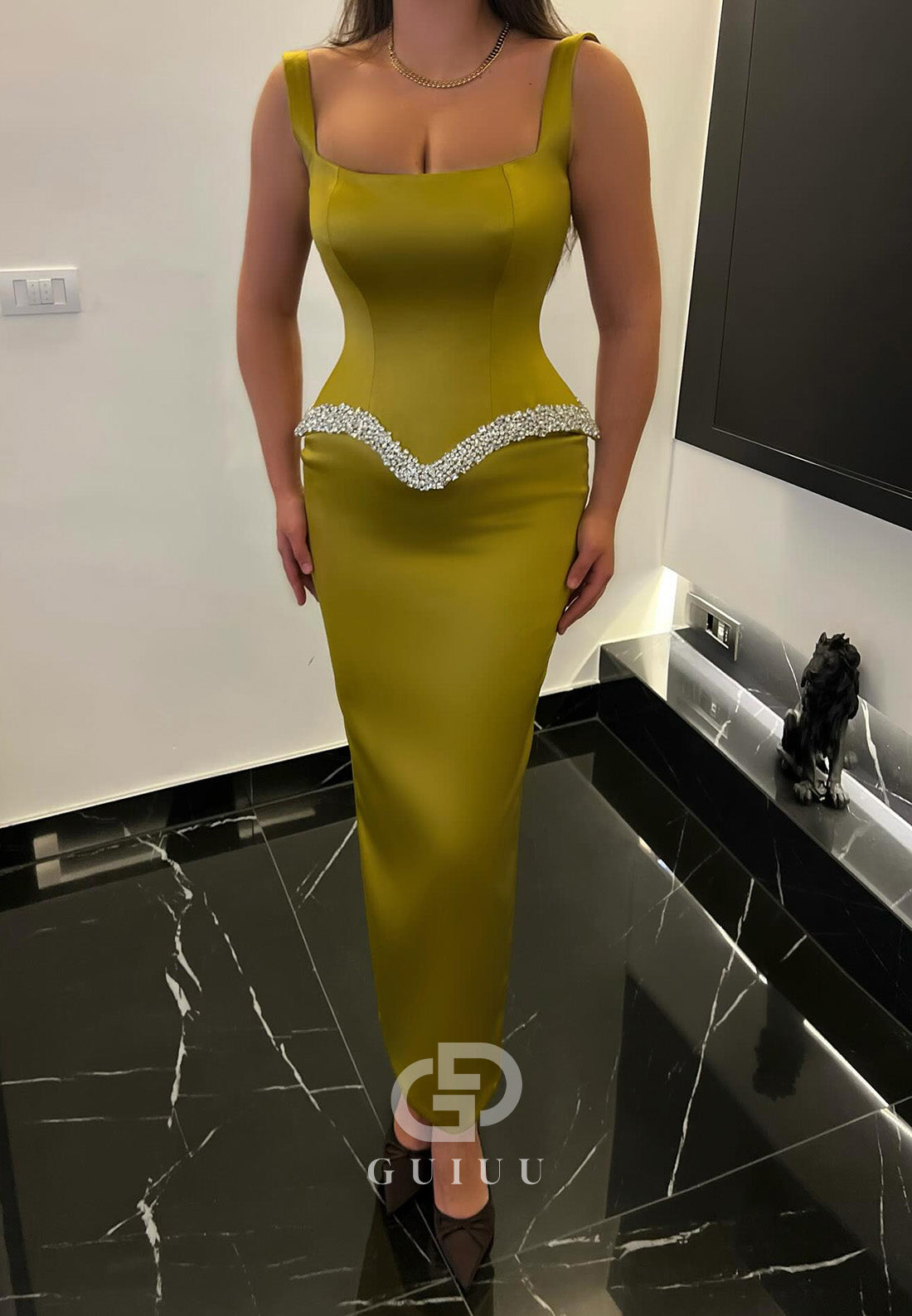This elegant sheath prom dress features delicate spaghetti straps and a scoop neckline adorned with pearls for subtle sophistication. The ruched design enhances your silhouette while providing comfortable support, allowing you to feel graceful and confident throughout your special evening.