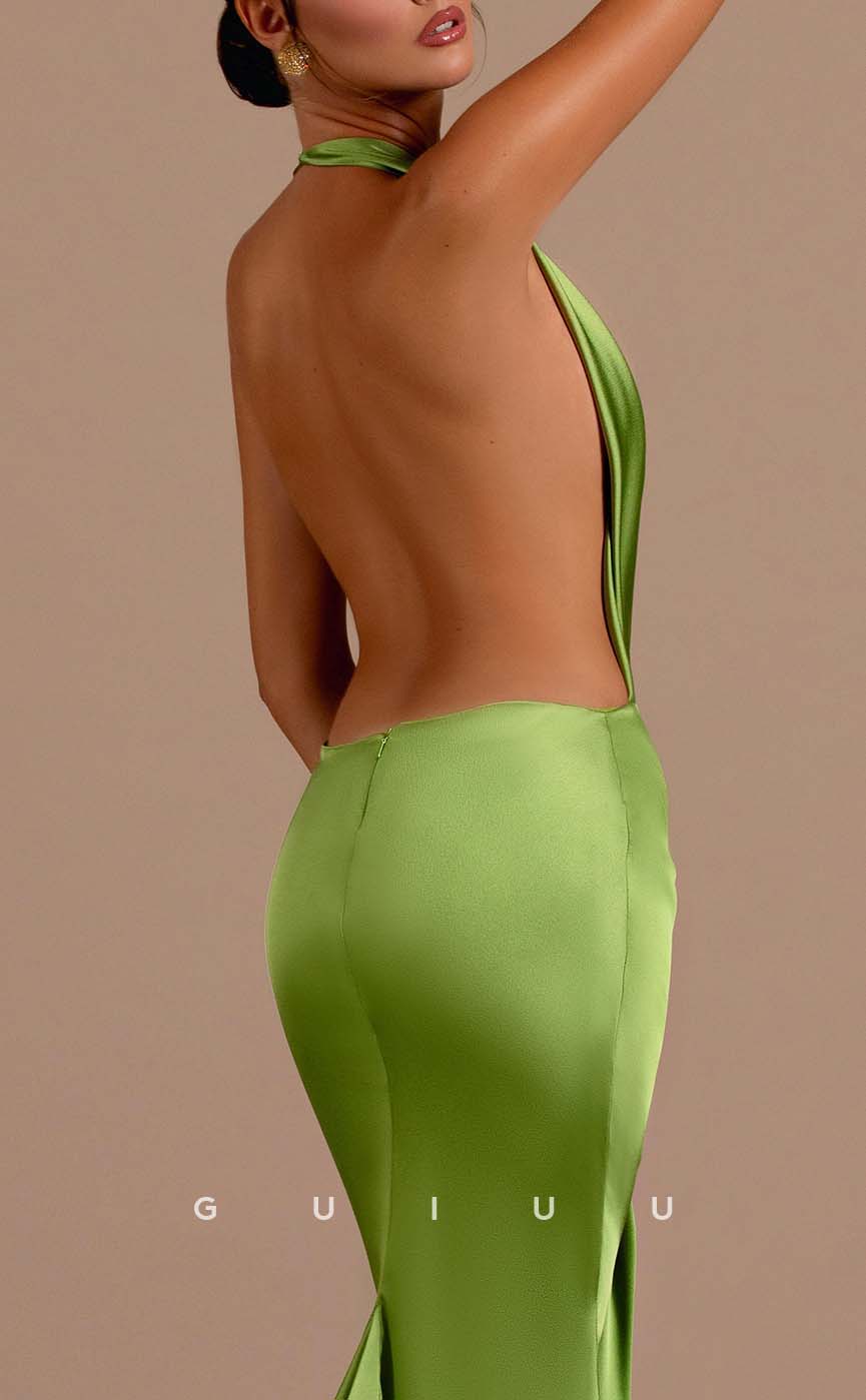 G3258 - Chic & Modern V-Neck Halter Pleats Open Back Long Formal Prom Dresses