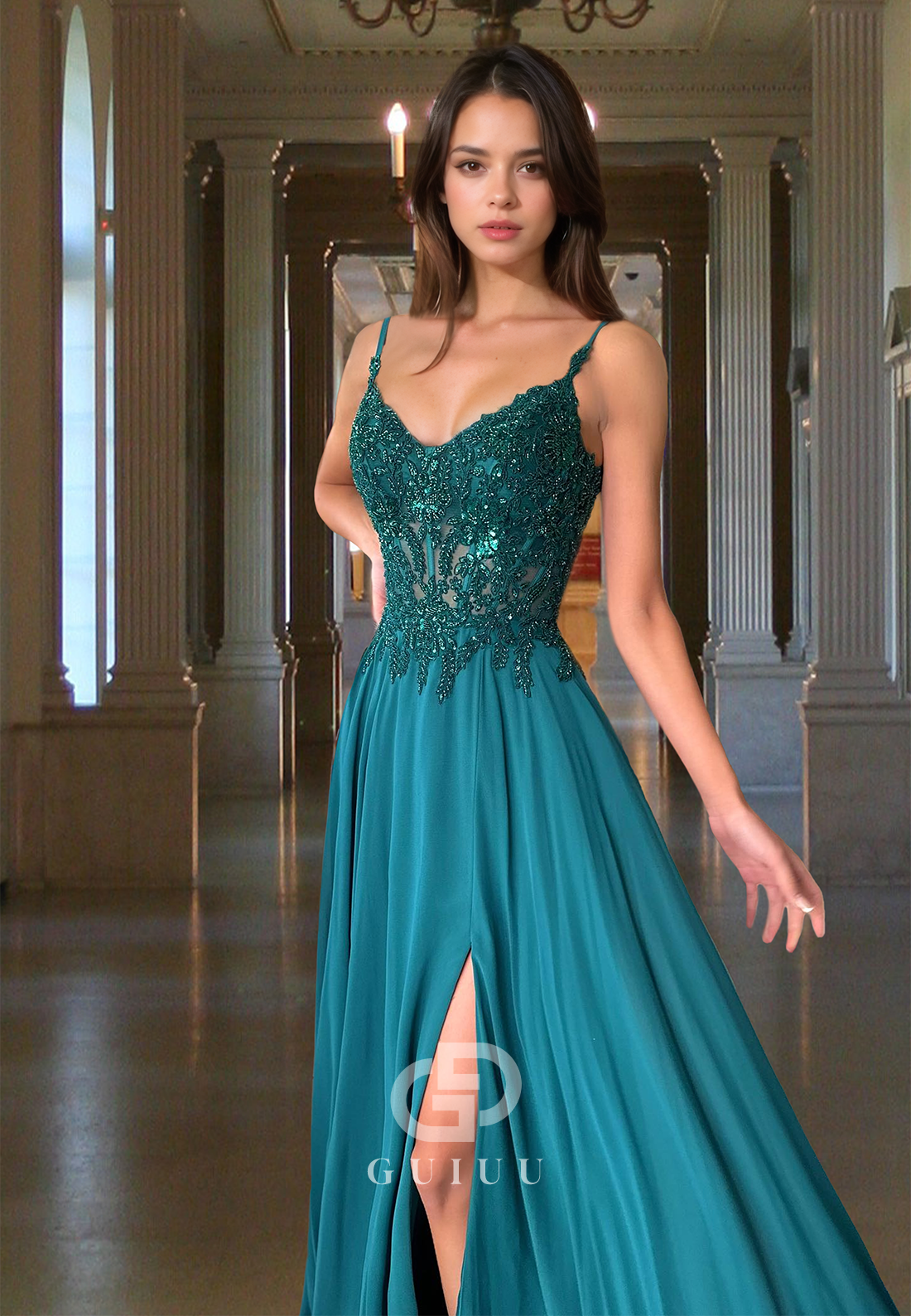 Peacock Spaghetti Straps V-Neck Prom Dress with Clit Corset Tulle Evening Party Dress