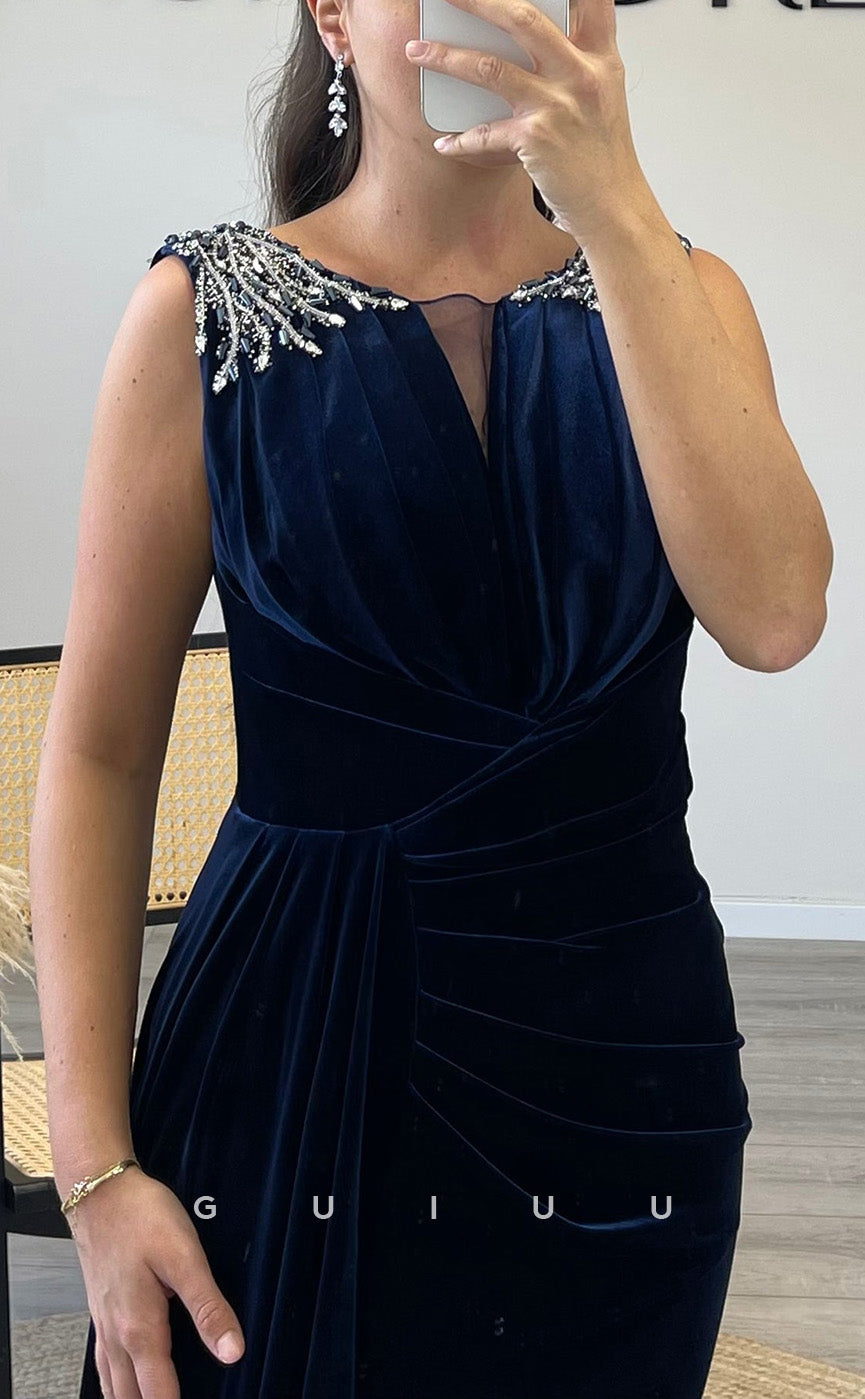 G3515 - Chic & Modern Sheath Bateau Draped Beaded Side Slit Half Sleeves Long Ballgown Prom Dress With Sweep Train