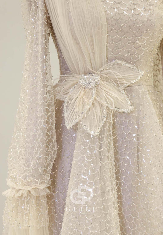 G4202 - Classic & Timeless A-Line High Neck Floral Beaded and Draped Formal Party Prom Dress with Long Bishop Sleeves and Ruffles