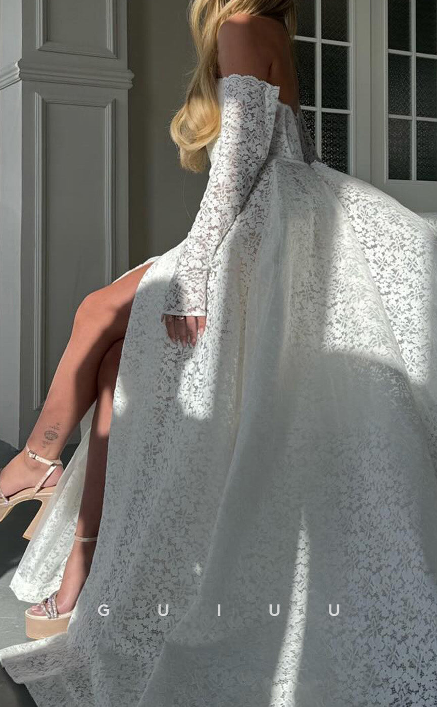 A-Line Strapless Long Gloves Fully Lace Formal Evening Dress with High Side Slit